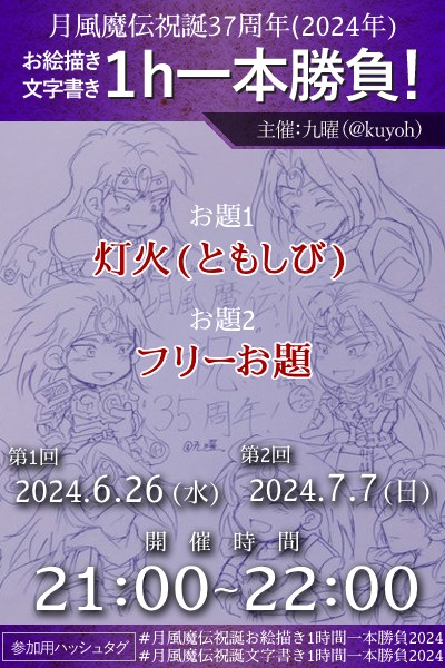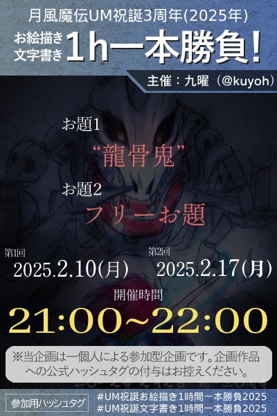 参加要項をお読みいただいた上で、理解のできる方でしたらどなたでもご参加いただけます。参加表明も報告も不要ですし、なんなら月風魔伝を遊んでいる必要もありません。「なんか月風魔がかっこいいので描きたい」オーケーです。むしろこの機会に描いてください。