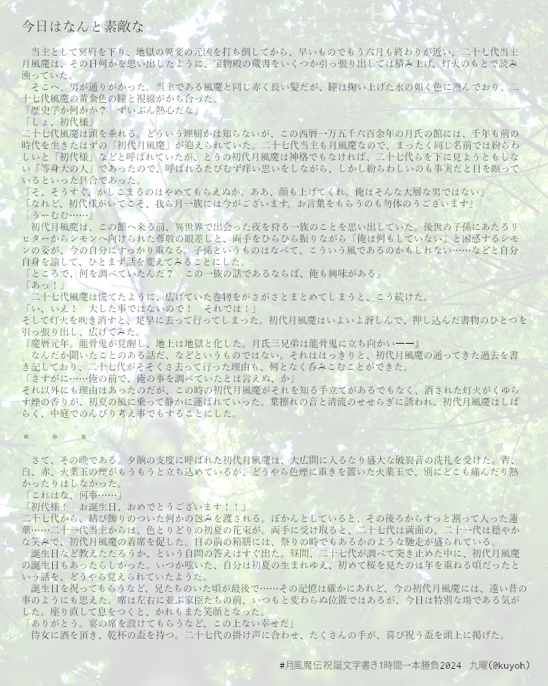 タイトルは『今日はなんと素敵な』内容としては「なんかよくわからないけどHD経由で館にやってきた初代月風魔の、6月26日(だと思われる。設定上!)の話」となっております。
