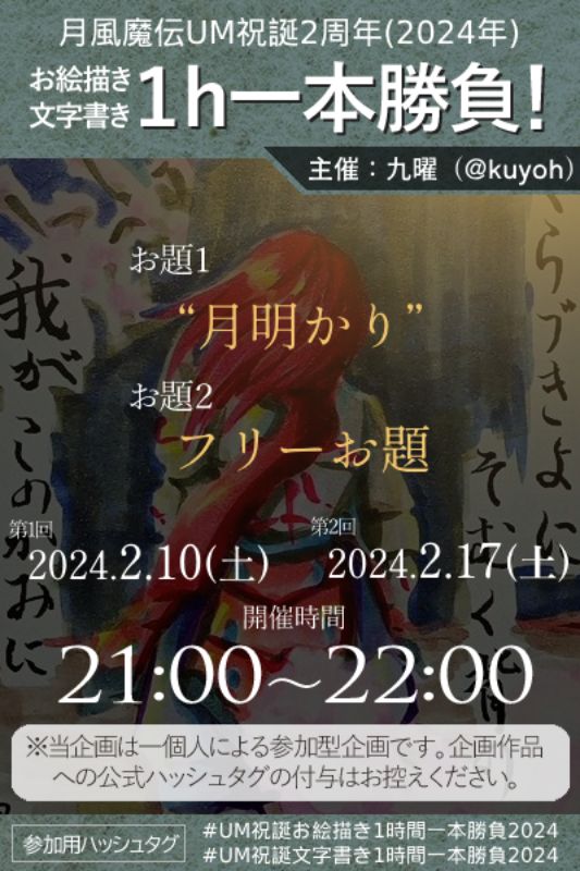 検索用ハッシュタグは #UM祝誕お絵描き1時間一本勝負2024 または #UM祝誕文字書き1時間一本勝負2024 となっております。