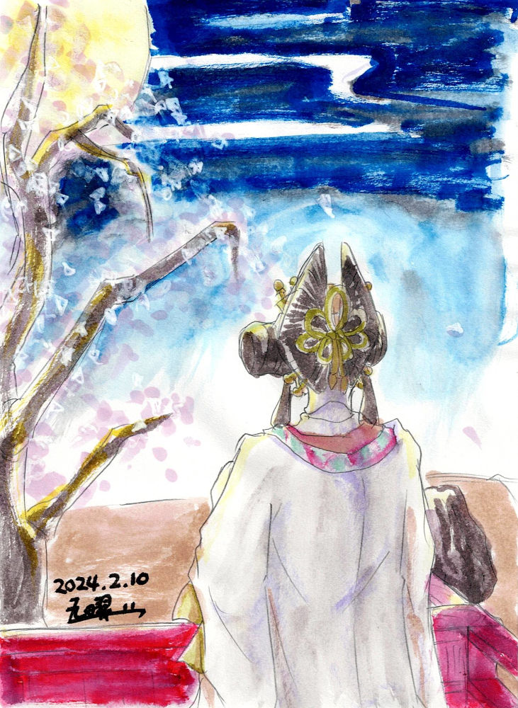 月氏の館はいつ訪れても満月です。館の傍に佇んでいる侍女もまた、満月のように変わらず当主を待ち続けています。作中での侍女の居場所は作品と違うのですが、時折月を眺めては、同じ月の文字を姓に冠した当主のことを案じているのかな…ということで、こんな絵になりました。