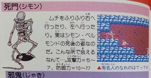 完璧攻略本及び、マル勝ファミコン増刊号には、死門について「シモン・ベルモンドのなれの果て」という記述があります。