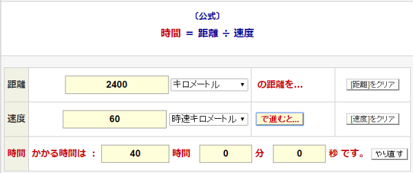 概算なので、休憩なしで全力疾走(時速60kmで定速扱い)してもらうことになります。