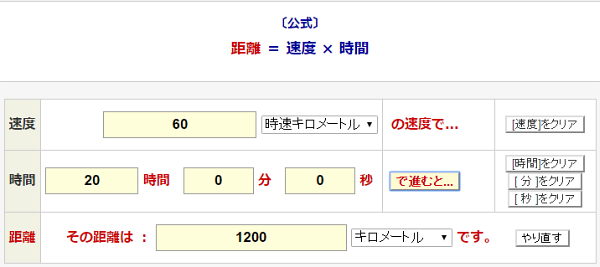 速度を時速60kmにして、距離を入力すれば時間が算出できます。