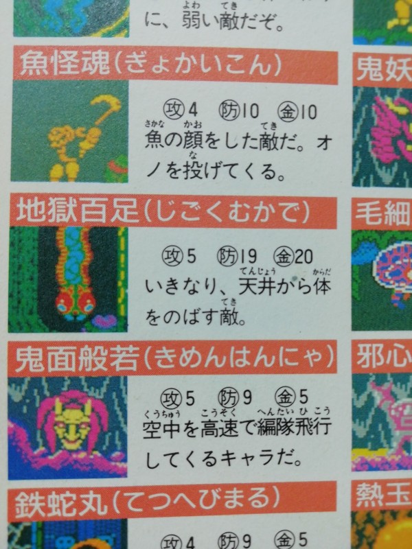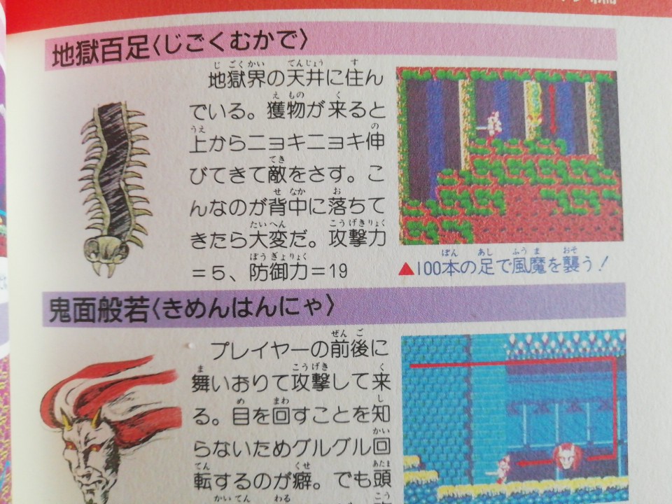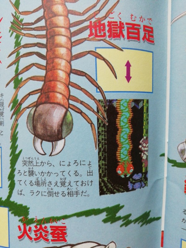 攻略本を調べてみると、いましたいました。その名もずばり「地獄百足」という名前で、天井から生えてきて進行を妨害してくるあいつ。あれがその魔物だそうです。