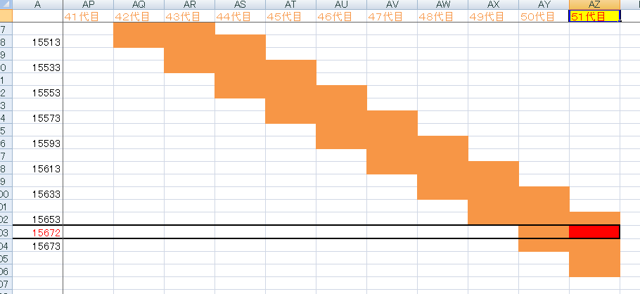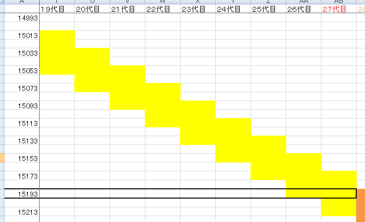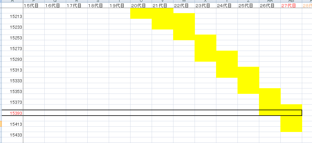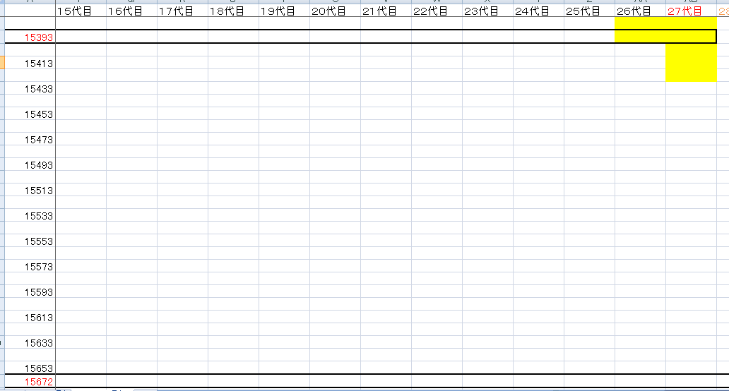 平均的にしたのもあって仕方ないと思いましたが、27代目が20歳になる段階で、西暦は15193年です。500年近くも足りない!