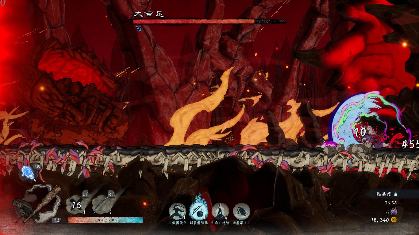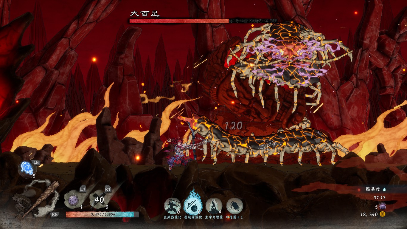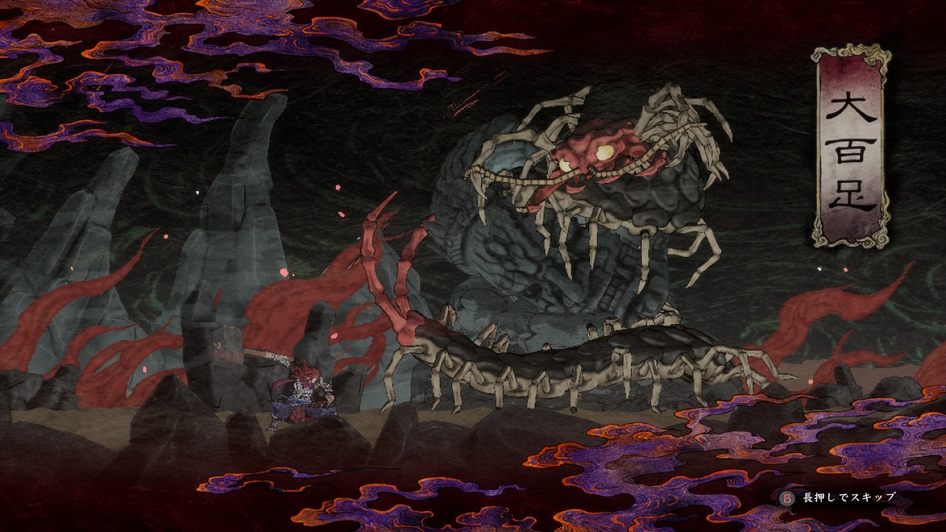 土煙とともに現れた大百足が雄叫びをあげ、画面内をうねるように突進してくることがあります。