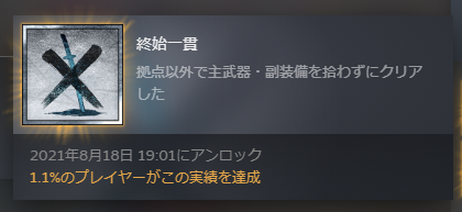プレイヤー全体の実績取得割合なども見ることができますが、私が取得した実績の中で最もレアなのがこの『終始一貫』です。