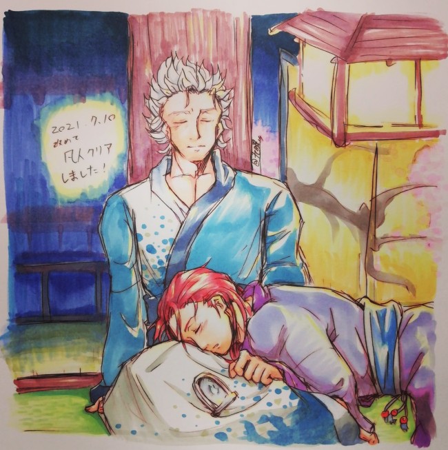 説明が遅くなりましたが、左上に書いていますね。凡人クリア記念の絵なのですが、「改めて」とあるのは、6/26に一度データを飛ばしてしまい地獄を走り直したからです。あれ以来怖くて大洞に行けていない。