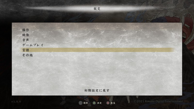 言語変更は結構大掛かりな調整だからか、ゲームを遊んでいる最中には変更できません。タイトル画面の「設定」を選び、「言語」から変更できます。