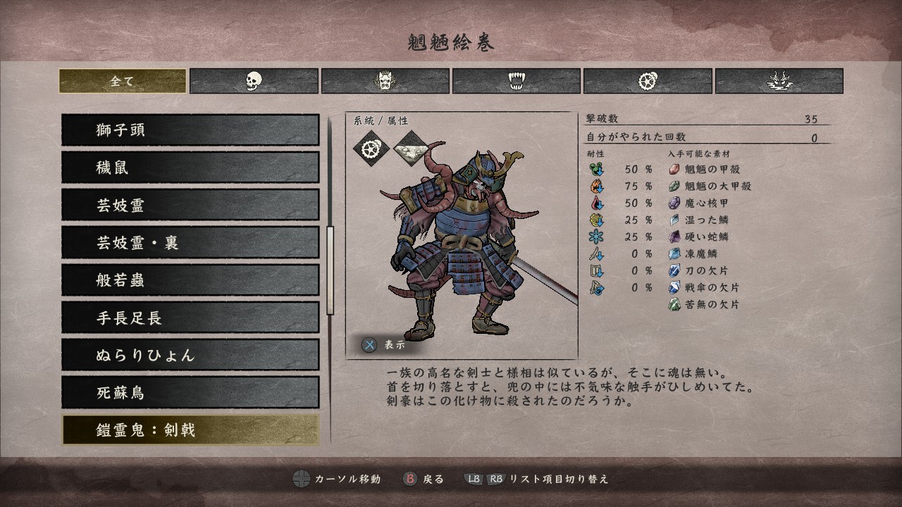 私の感覚ではこの鎧霊鬼、魔暦元年よりも昔に古宮都にいた、月一族の剣士ではないかと思われます。嵐童が足止めされていたことを見る限り、風魔君が封印してから古宮都へ通り抜けるのは無理そうですし、その状態では、外部で魑魅魍魎と化した当主が古宮都に引きずり込まれる…といったこともないでしょう。戦場跡までの地獄と古宮都は、完全に隔絶されているといった印象です。加えて、当主に存在するはずの吸魂機構が鎧にない、つまり当主でないか、吸魂技術が未発達な相当昔の一族であるか、だと思われます。