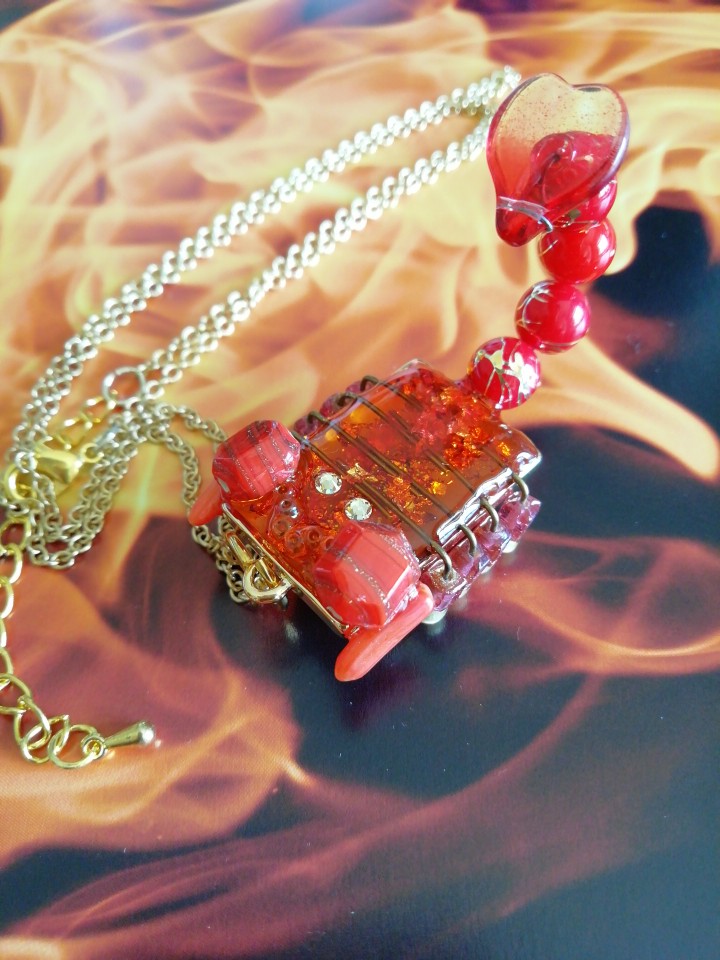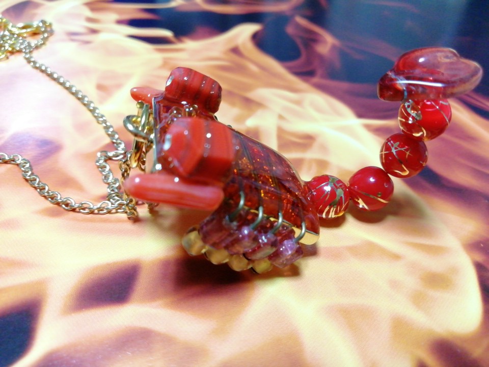 本物はもっと暗かったりとげとげしてますが、あんまりとげとげしいと触れないですし、ペンダントとして身に着けるものなので、せなかに箔など入れて豪華にしてみました。尻尾の和風模様ビーズも、いい具合にオシャレになったと思います。蠍ですが。