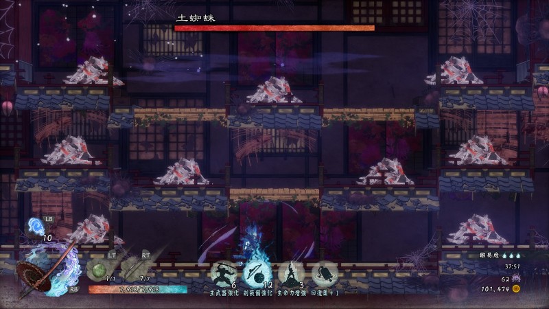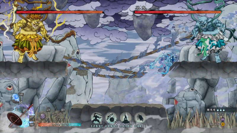 加えてこの双子の鬼、地形を変化させて足場と棘を出現させます。複数の敵に狙われている中、ほとんど必ず踏むことになる棘の床を突っ切って進むのは危険です。