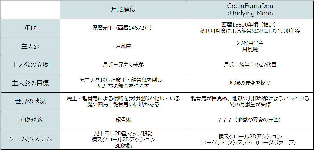 表にすっかり書き忘れていましたが、『月風魔伝』と『Undying Moon』では冒険の舞台も違います。前者は龍骨鬼が根城としている魔の四島、後者は地獄の内部です。これは私の考察ですが、戦いの舞台が地上から地獄内部へ移った、と考えられます。