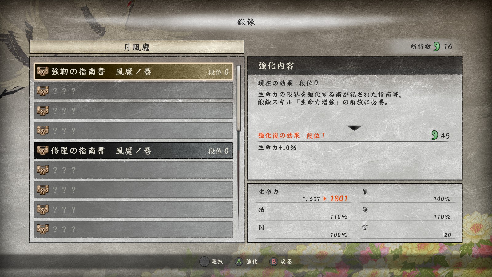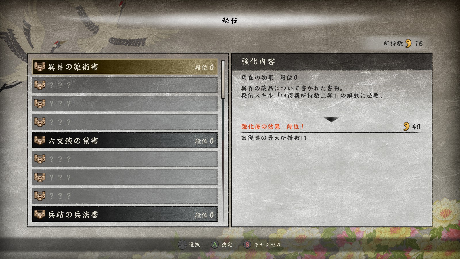 一部の伝書については初期状態で所持しており、道中でまったく伝書を拾わなかった場合、強化できる鍛錬・秘伝については限定されてきます。