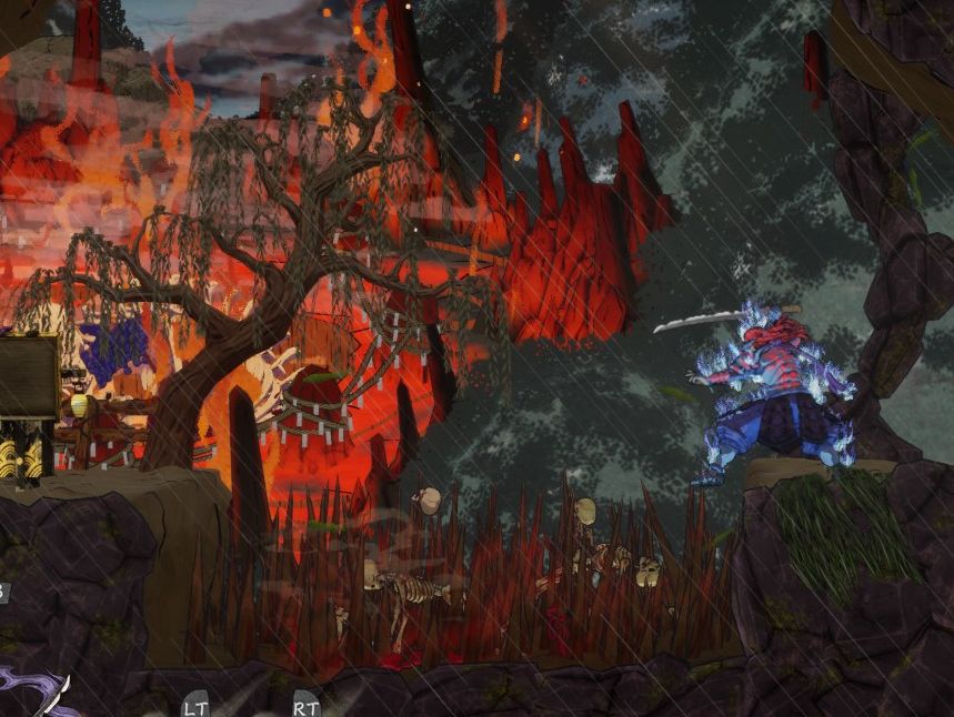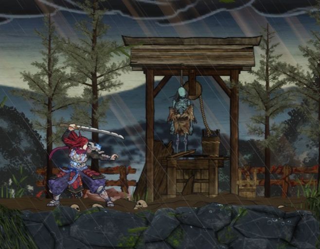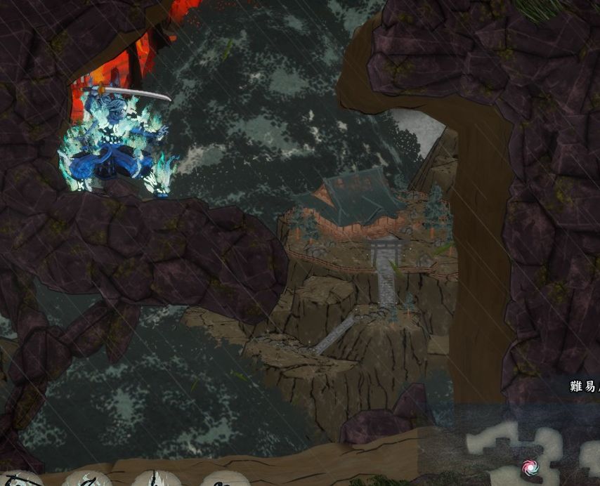 Twitterにて「地獄はサイドビューだけど、アリの巣観察キットみたいになっているの?」と喋っていたフォロワーさんがおられたので、この柵の存在や遠景の見える道程を考えると「奥側が崖、手前側(プレイヤーの見ている側)は実際には壁」というのが、自然なようにも思えます。落ちてしまわないための柵だったり、遠く目下に龍骨鬼の見える景色だったりするのでしょう。