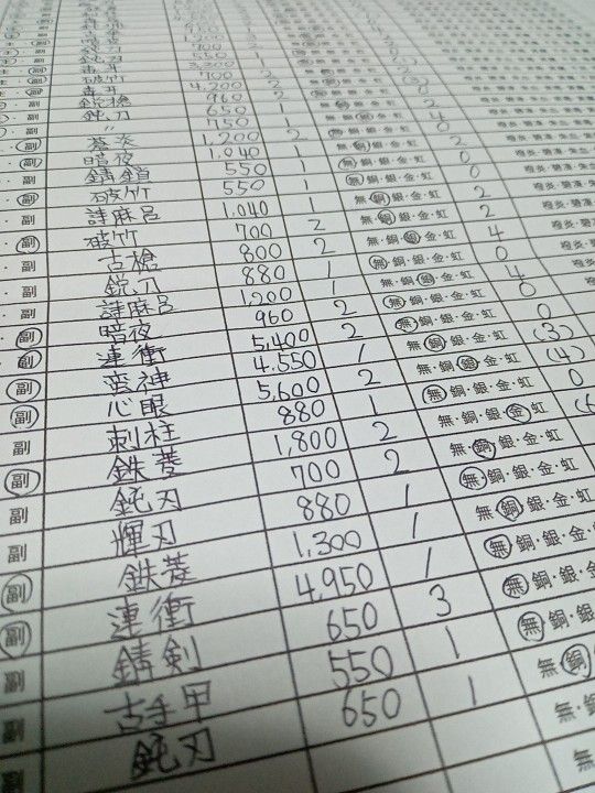 調査段階では、主武器で価格4桁に乗っているのは、一番高いもので無銘の扇刃(段位2銀レア)の価格1,280でした。忌地で貯められない金額ではないので、両得物が得意な当主なら、龍骨鬼戦に持ち込むことを検討できると思います。