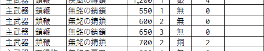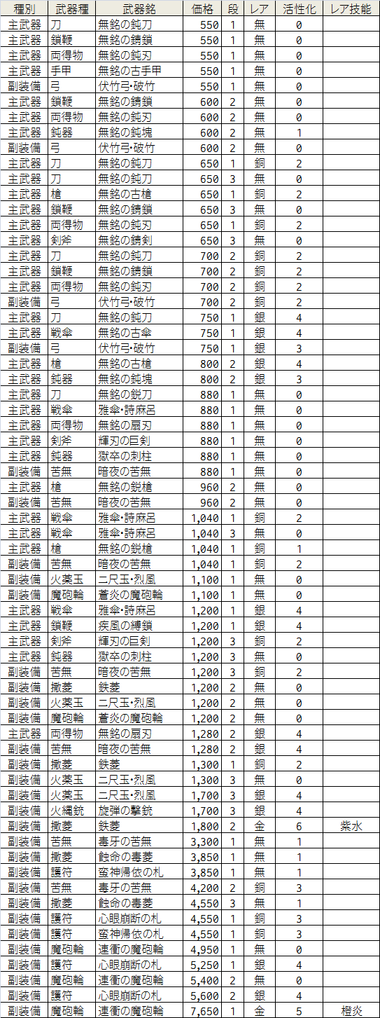 表を見ると、鈍刀や錆鎖、破竹などの価格550が底値のようです。とはいえ、いずれも館から持ち出すのと同程度の性能なので、もうちょっと金子を貯めて、少しでも良い武器を買った方がいい気がします。特に段位1鈍刀は確定で館から持ち出せるので、ここで買う意味はかなり薄いと思われます。