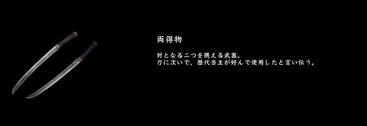 鎖鞭の説明文からするに、当主としてはある程度の武器を扱えるように鍛錬するものの、主要な使い手の多さとしては刀>両得物>その他、でしょうか。個人的にあの両得物を使う当主が多いのが凄いと思いました(苦手武器)