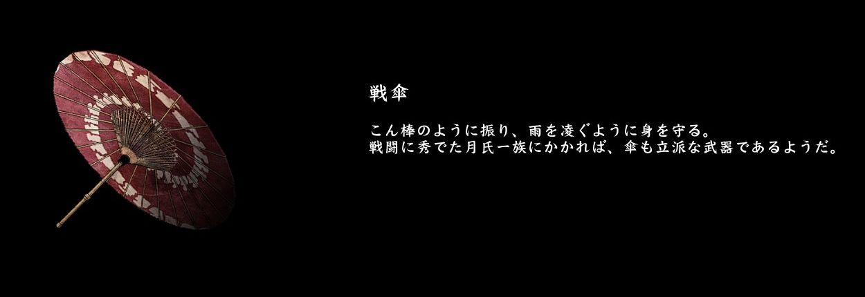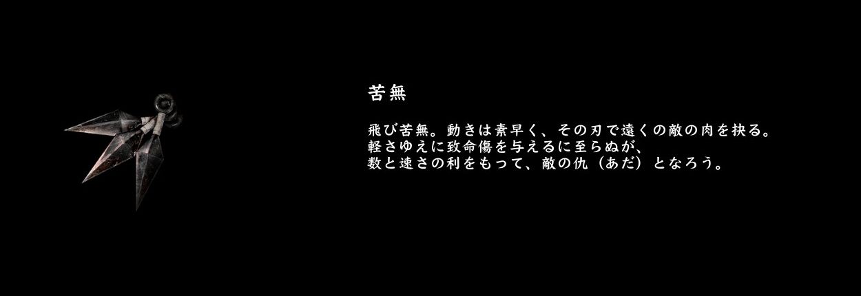 鎖鞭と手甲は説明文で扱いの難しさが見てとれ、戦傘や剣斧についてはノーコメントなので、そのあたりの使い手は限られるのかもしれません。あ、九曜当主は貴重な戦傘の使い手です。