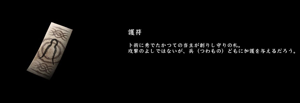 副装備については、まずお守りを軽量化しつつ、効能を細分化したものとして護符が作られると思われます。鴻明が陰陽師としての能力を活かし、加護を封じたこれが後世でも役立ったため、千年後にも什具として未だ用いられているのでしょう。説明文にある「かつての当主」というのも、恐らく鴻明であると思われます。