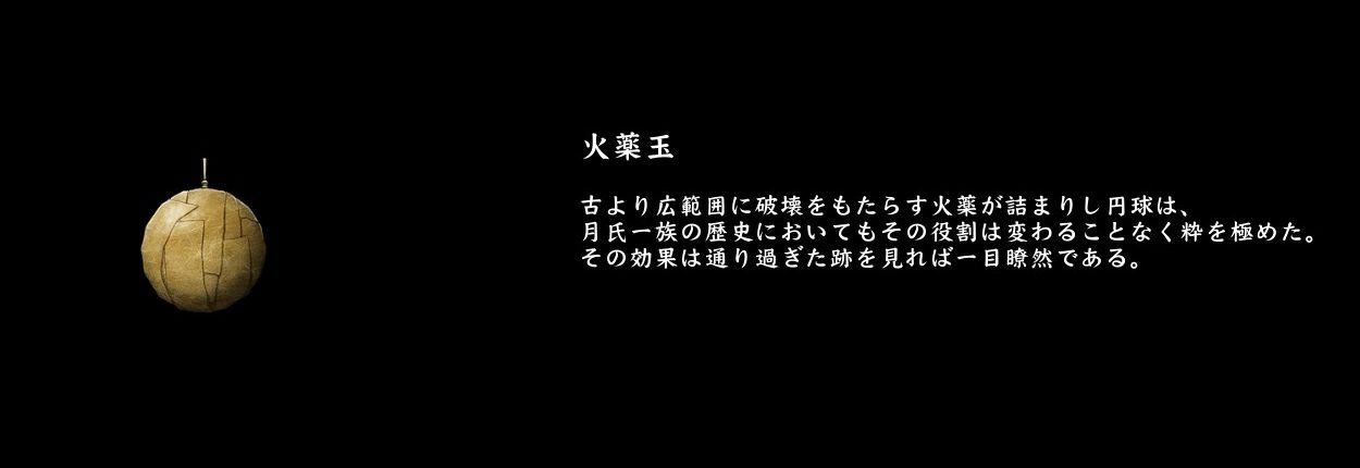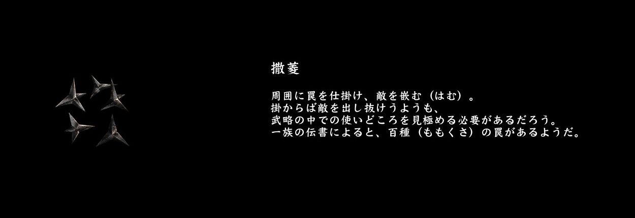 副装備にあたるアイテムは、案外たくさんありますが、後世に継承されていそうなのは「手裏剣(→苦無)」と「呪いの爆薬(→火薬玉)」、「お守り(→護符)」といったところでしょうか。厳密には挙動や効果が違いますが、うっすら似ている装備はいくつかあります。