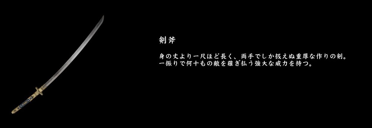 主武器、つまり常時装備の武器となるのは2種の刀です。いずれも剣表記ですが、形状的にも後世の主武器分類でも剣ではなく刀なので、とりあえず刀としておきましょう。