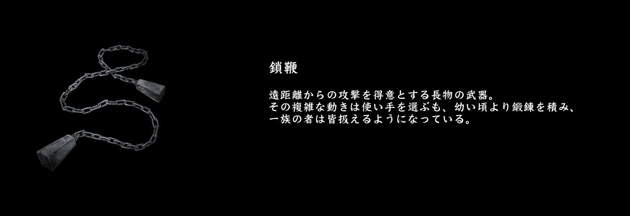 鎖鞭:幼い頃より鍛錬を積み、一族の者は皆扱えるようになっている。