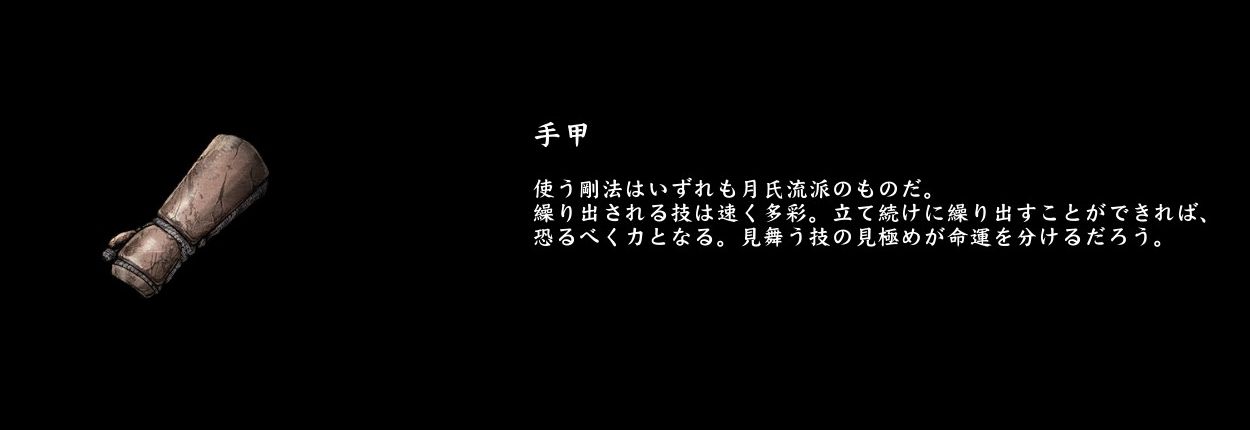 最後に手甲なんですけれども、この武器を扱う当主は近接特化、それも喧嘩に強いイメージが想起されます。となると、酒飲み大食いの鬼を屠りに行く当主とか、地獄の女を連れ帰る生臭当主だとかが「そっち系」であるのかもしれません。