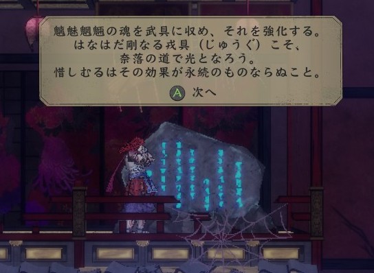 ざっくり訳してみると「魑魅魍魎の魂を武具に吸収させ、それを強化する。とても強い武器があれば、地獄行脚の助けになることだろう。残念なことは、強化が永続しないこと」という具合です。