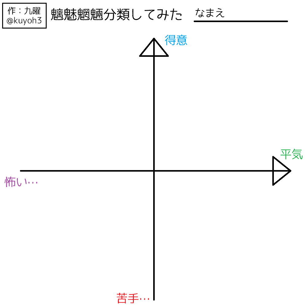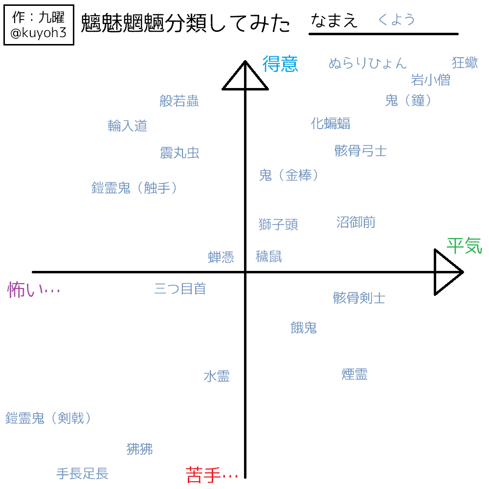 例えば、怖くもないし対処も得意なら右上に、逆に出会うと足がすくんでしまって対処も不得手なら左下に、魍魎の名前を配置していく形の図になります。