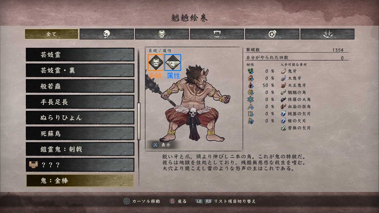 …というように、初見でもざっくり判別できますが、必ずしも全魍魎がこの通りではありません。もし特効武器を活かしたいと思う場合は、ちゃんと魍魎絵巻で確認することをオススメします。