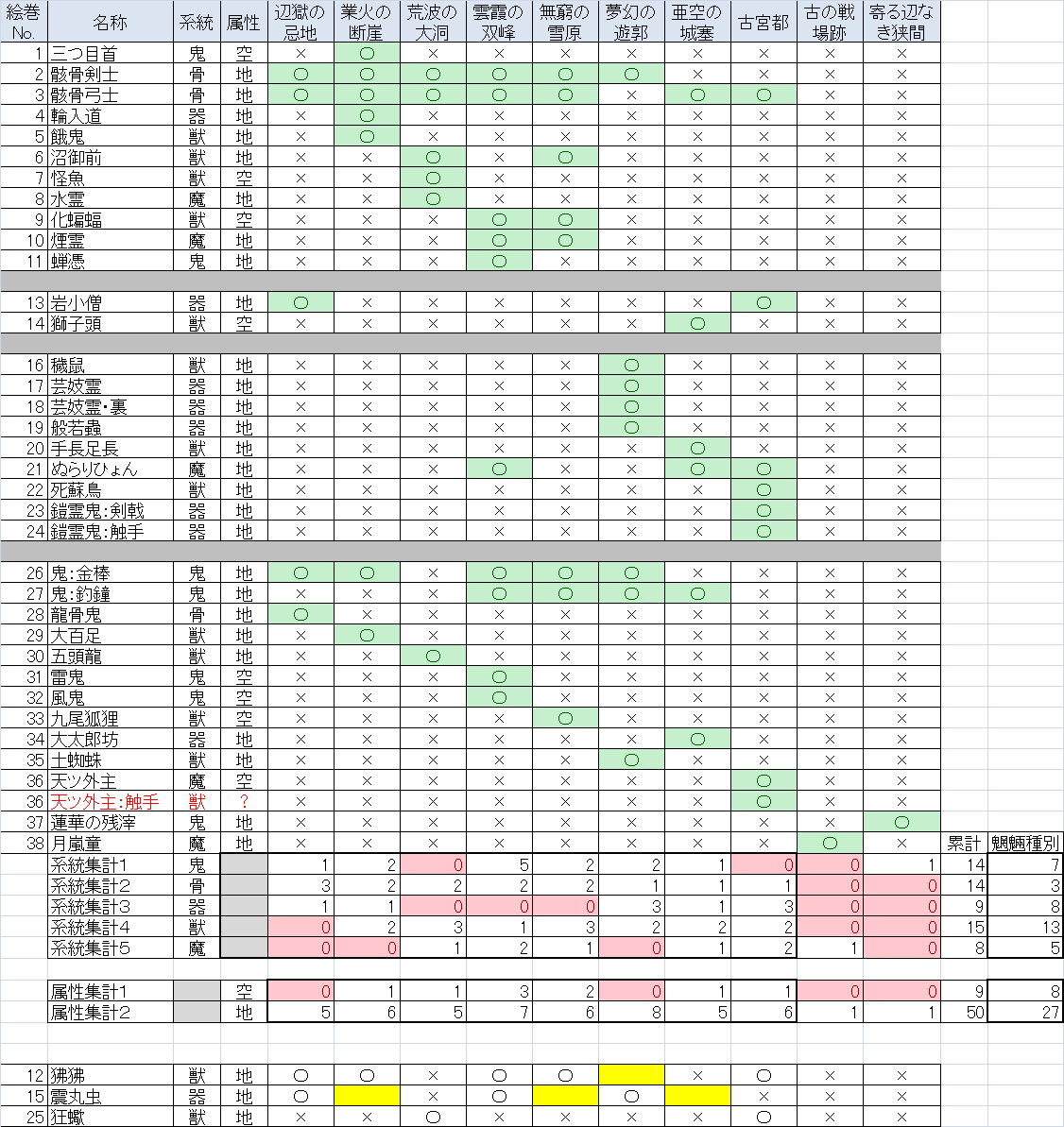 魍魎種別(魍魎そのものの系統属性別計上)を見ると「獣」が13種、「地」が実に27種というものすごい偏り方です。8種しかいない「空」のうち4体はボスクラスですし、3種いる「骨」のうち1体は