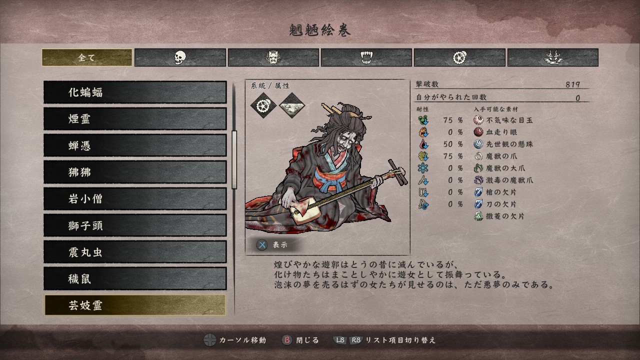 逆に「魍魎の個性づけ」として設定されている耐性は、水霊・煙霊・岩小僧の出血耐性100%があります。かれらは確かに血が出なさそうなので、正しく出血耐性がありそうに思います。一方で芸妓霊はどう見ても絡繰ですが、出血耐性50%なので出血するようです。意外や意外。