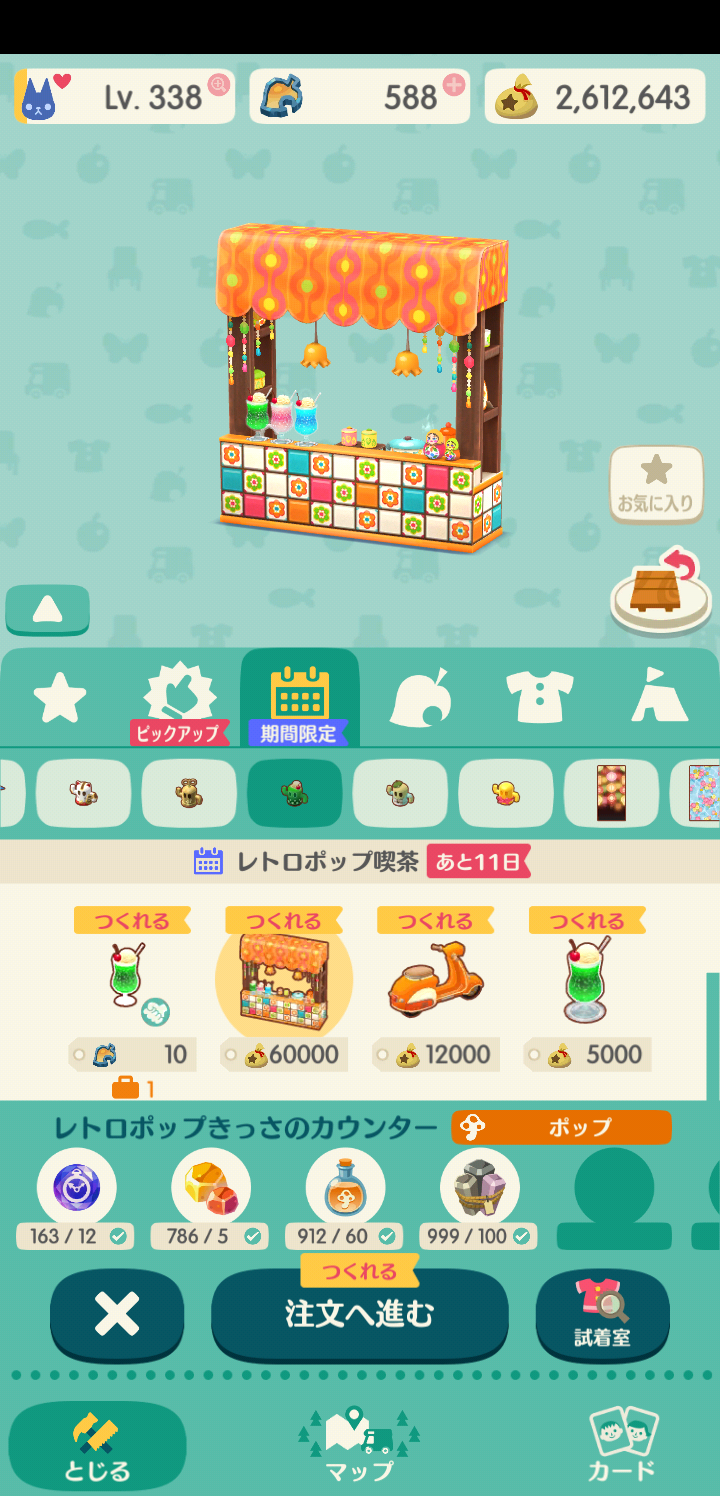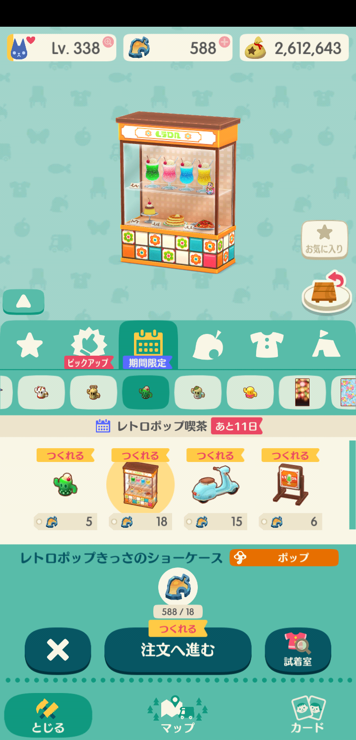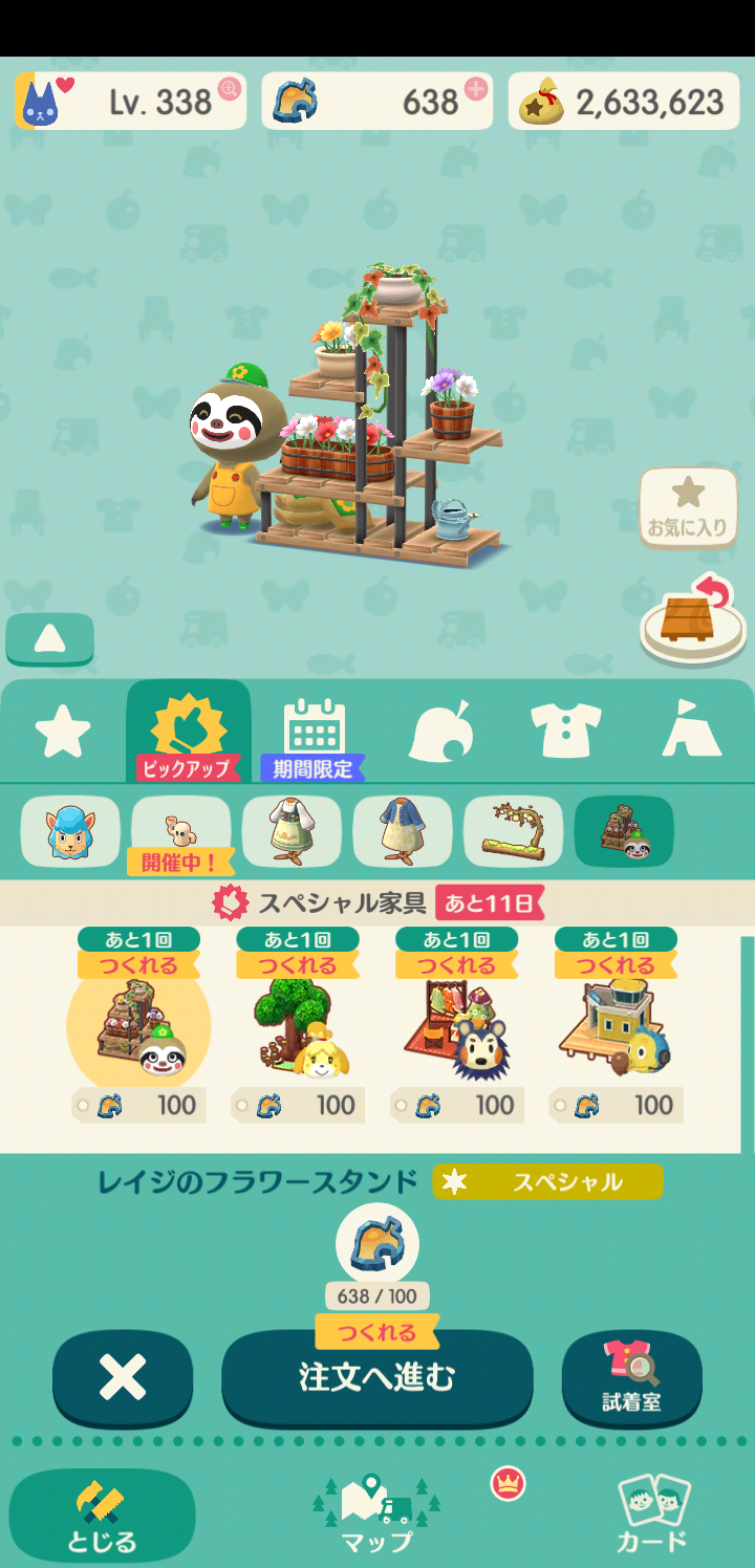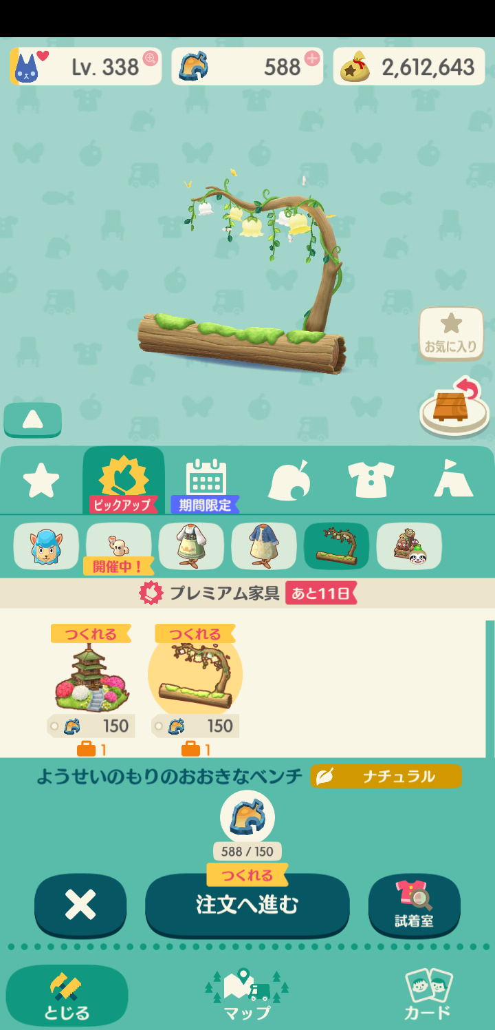 プレミアム家具は全部で18種あるので、チケットが18枚以上あるなら、とりあえずこれらを一通り作ってしまうのもアリです。もちろん欲しいものだけ作って、他の家具や服のためにとっておくのも良いでしょう。
