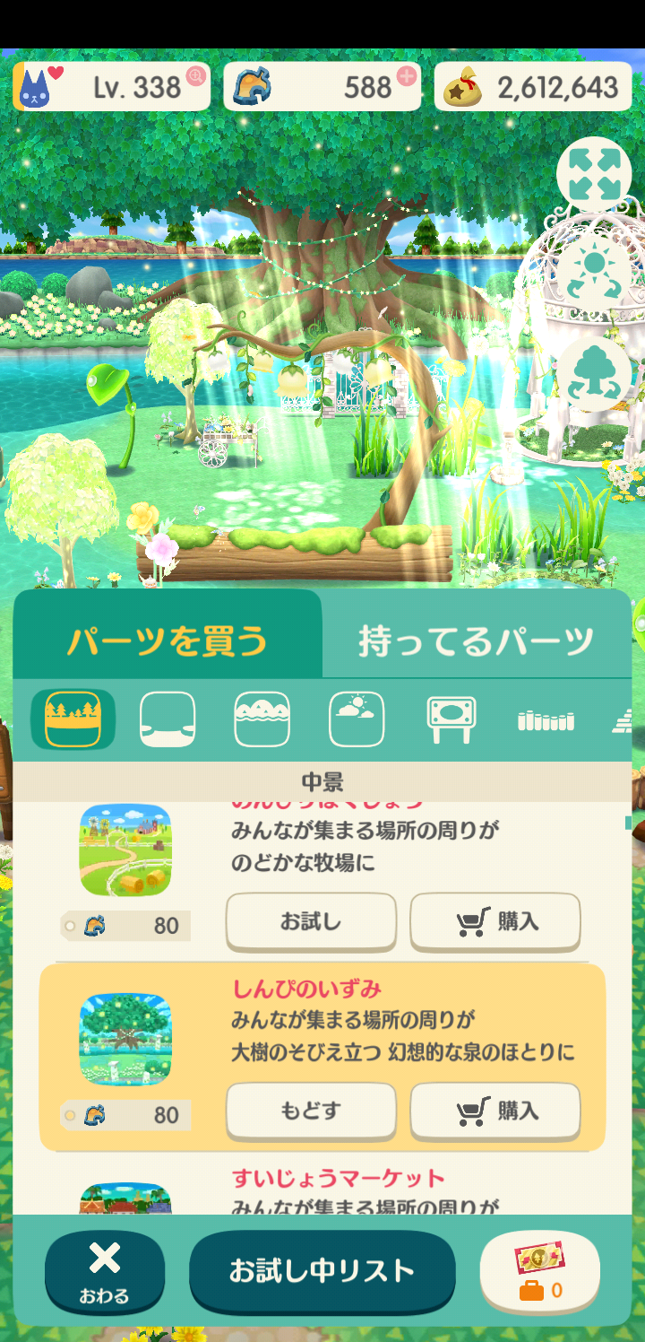壁紙、イベント家具、衣装などでリーフストーンを18程度消費するようなら、チケットでの交換も検討します。一桁消費で作れるものは優先的にリーフストーンで作ります。