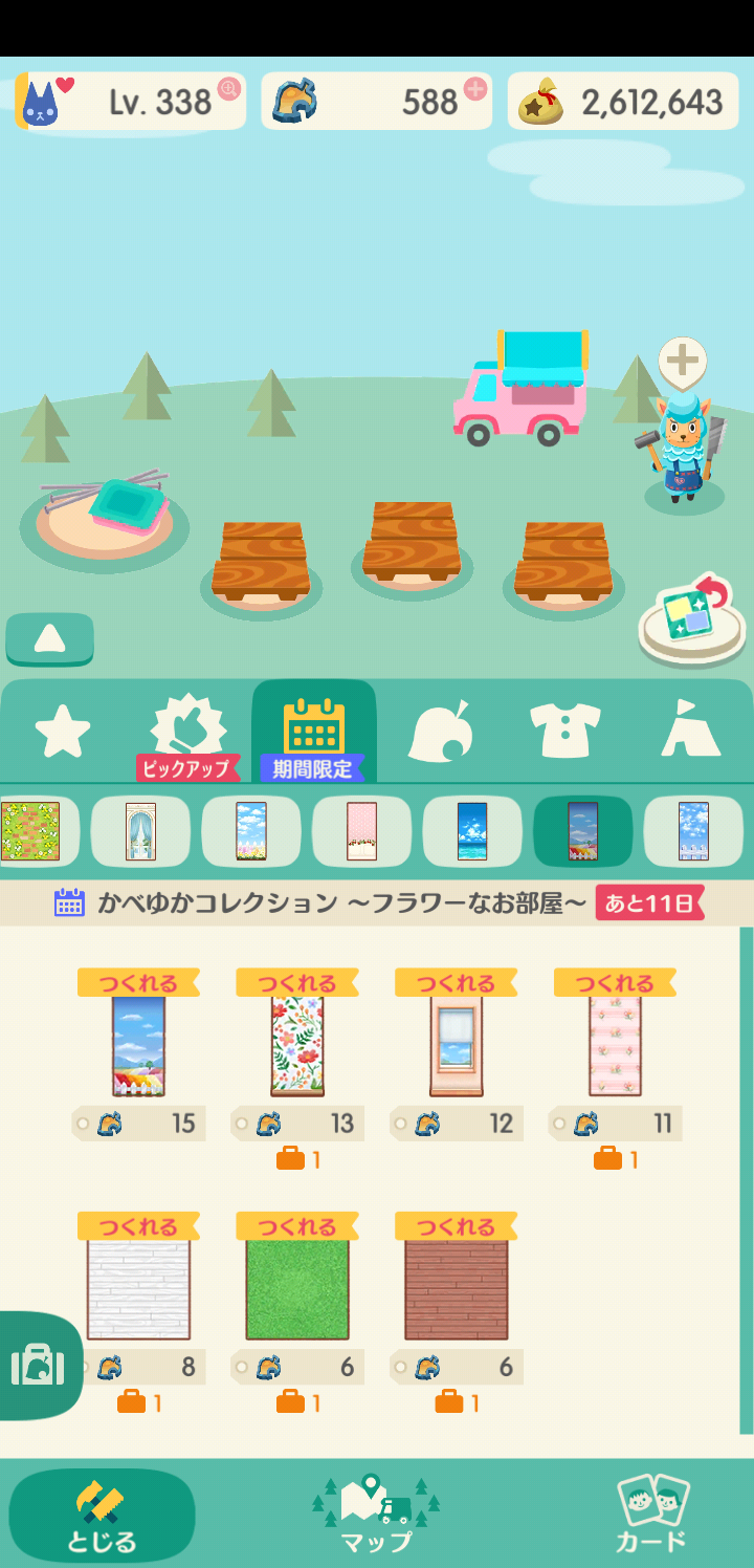 壁紙と床は大量に必要になる家具ではないので、難しく考えず、すぐに欲しいならチケットで取ってしまってもいいと思います。使い勝手のいい床や壁から揃えていくと、コーディネートの幅が広がりやすくなります。