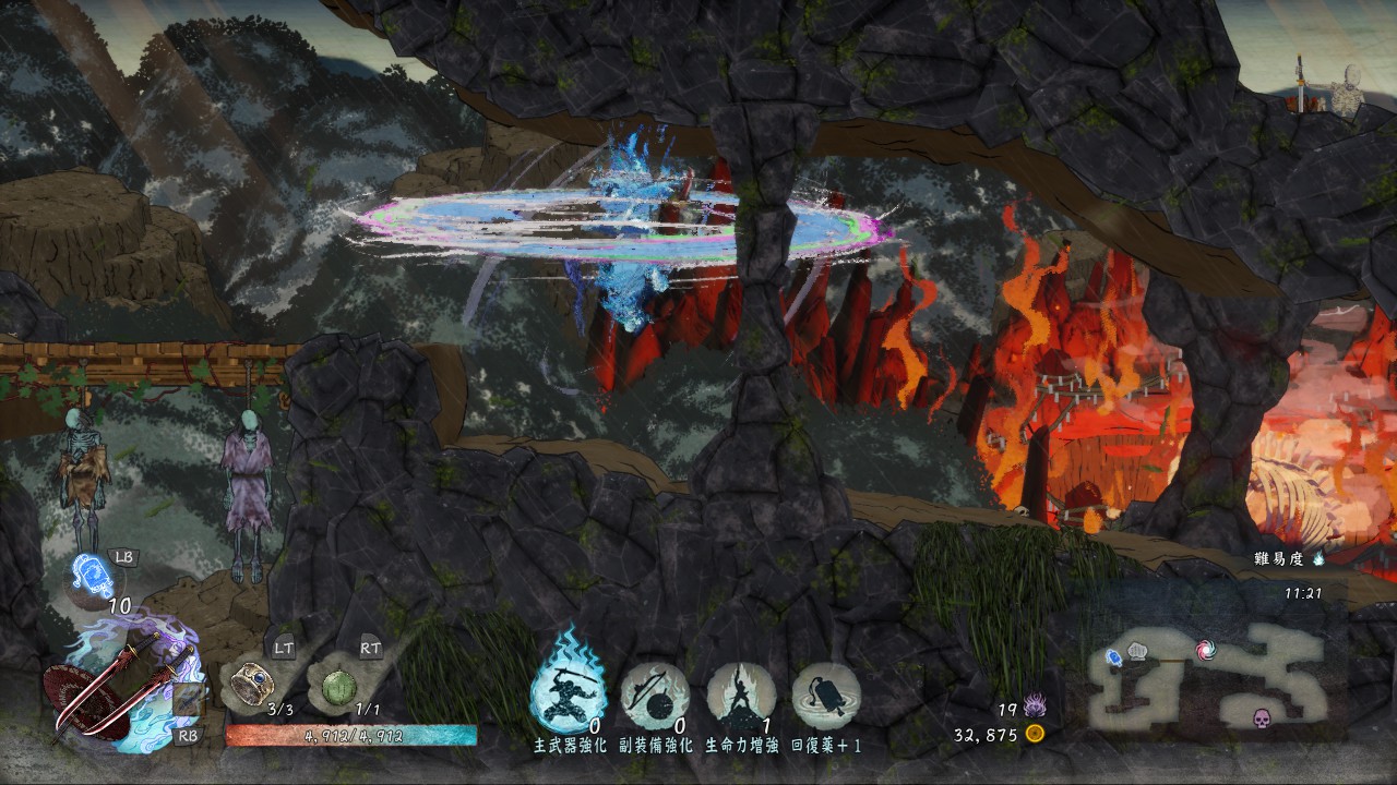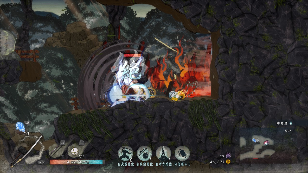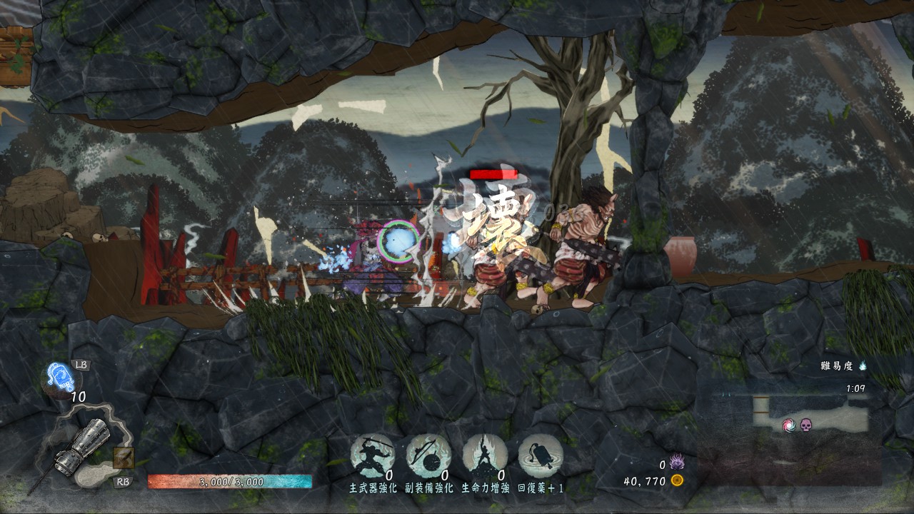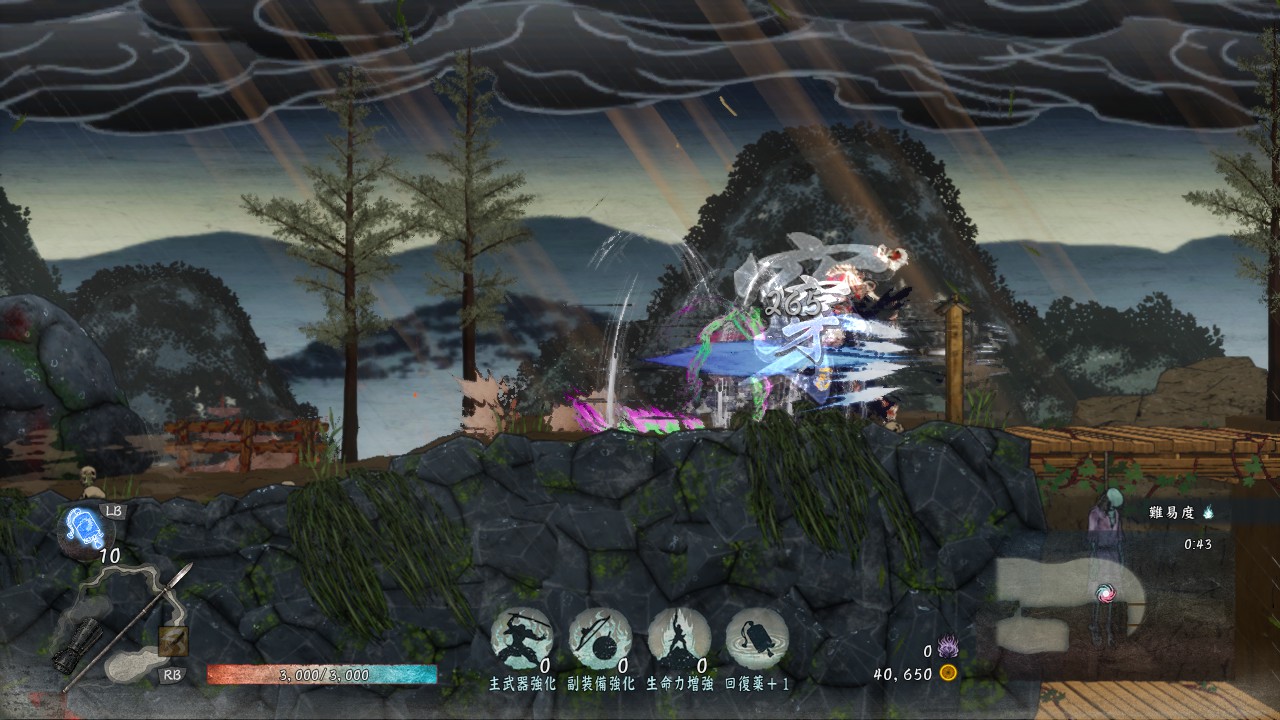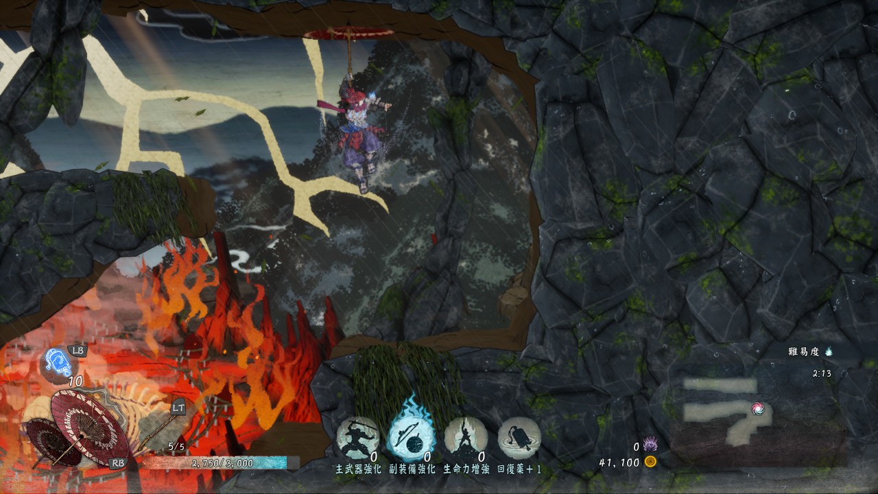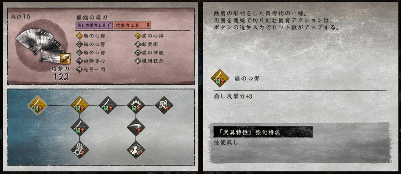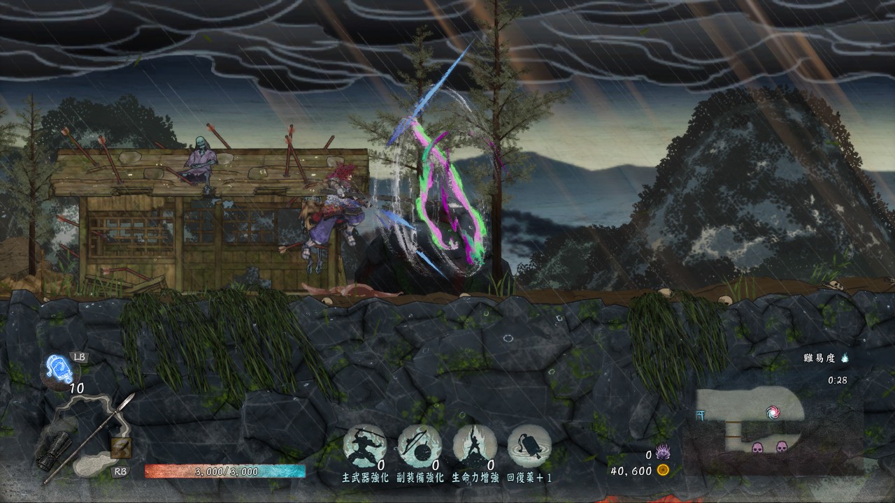 通常攻撃は地上で2回、空中だと1回しか出せませんが、敵を崩す力がかなり強いので、敵を「崩」状態にしやすいです。「崩」状態の敵にさらに追撃することで「殺」が発生し一撃死、あるいは高いダメージを与えられるので、「殺」を使いながらステージを進んでいきたい時には有効な武器です。
