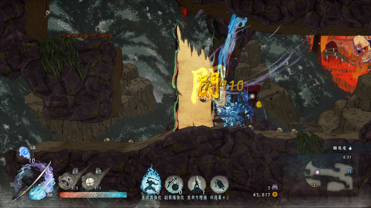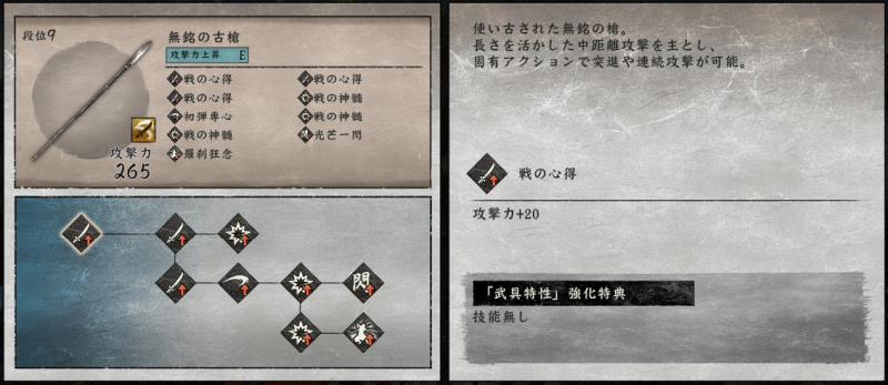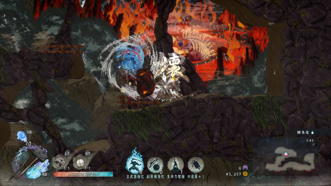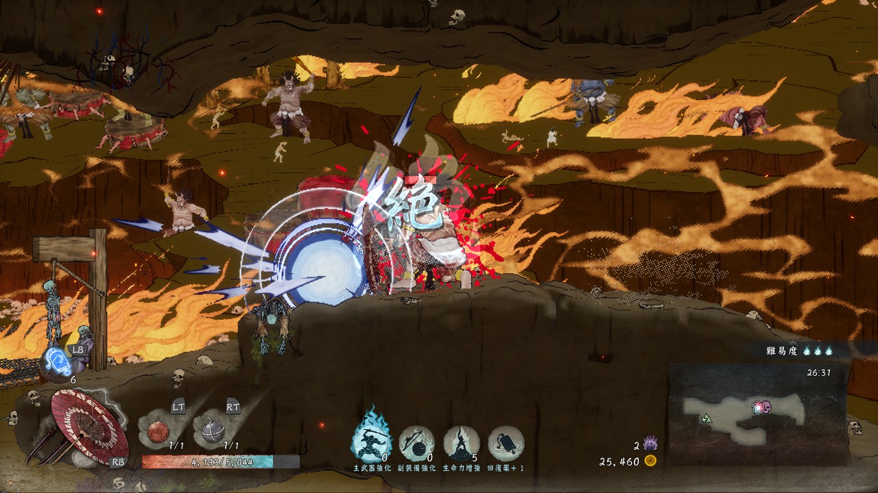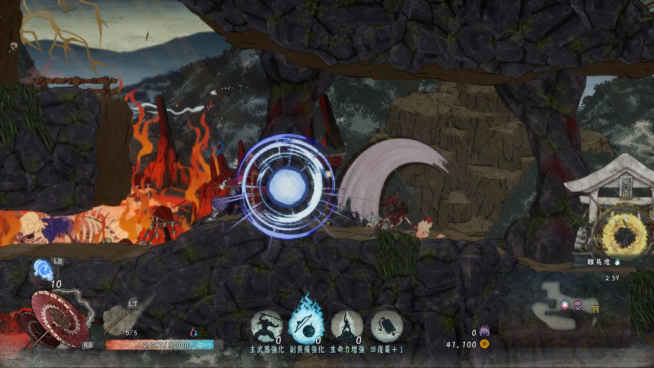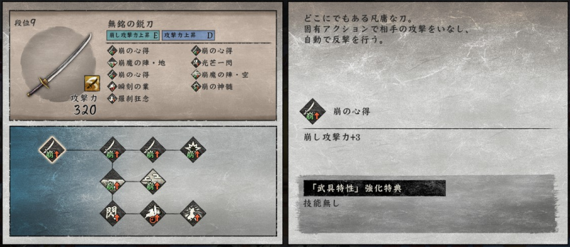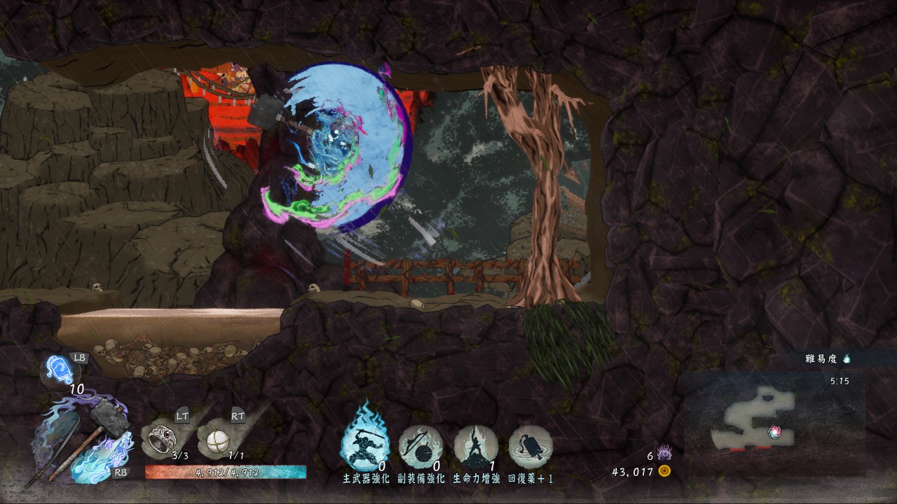 通常攻撃は地上で2回、空中だと1回しか出せませんが、敵を崩す力がかなり強いので、敵を「崩」状態にしやすいです。「崩」状態の敵にさらに追撃することで「殺」が発生し一撃死、あるいは高いダメージを与えられるので、「殺」を使いながらステージを進んでいきたい時には有効な武器です。